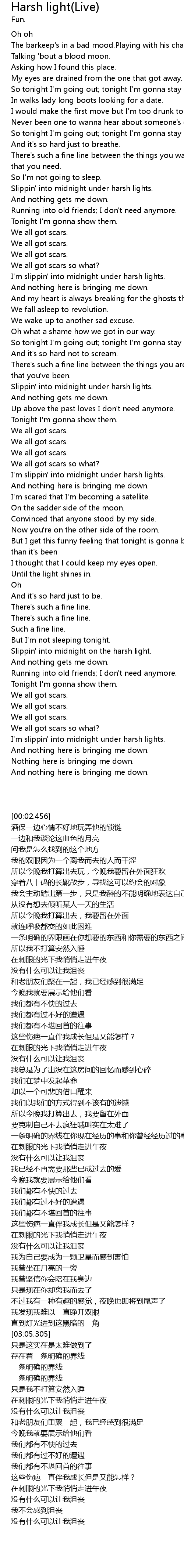 | [03:25.296] | Slippin' into midnight on the harsh light. |