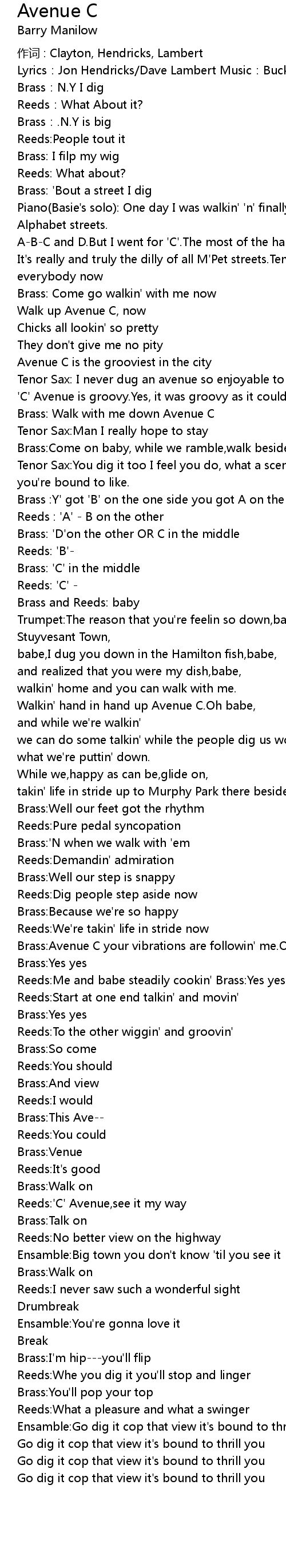 | Brass:Avenue C your vibrations are followin' me.Oh yes | |