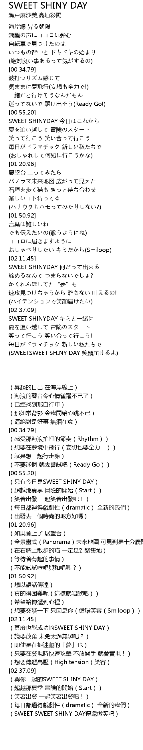 | [03:22.33] | (SWEETSWEET SHINY DAY 笑顔届けるよ) |
