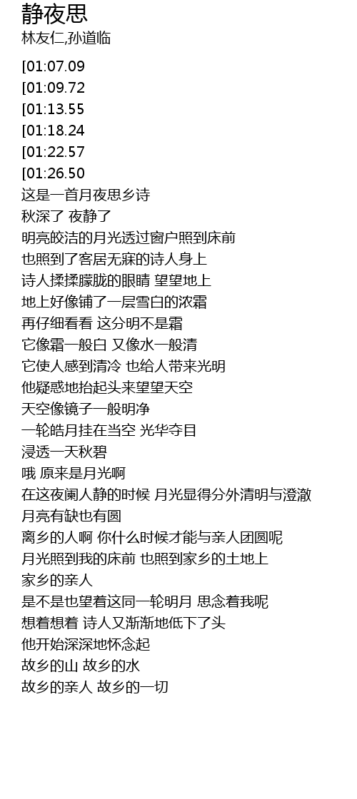| [04:09.67][01:07.09] | 《静夜思》 |