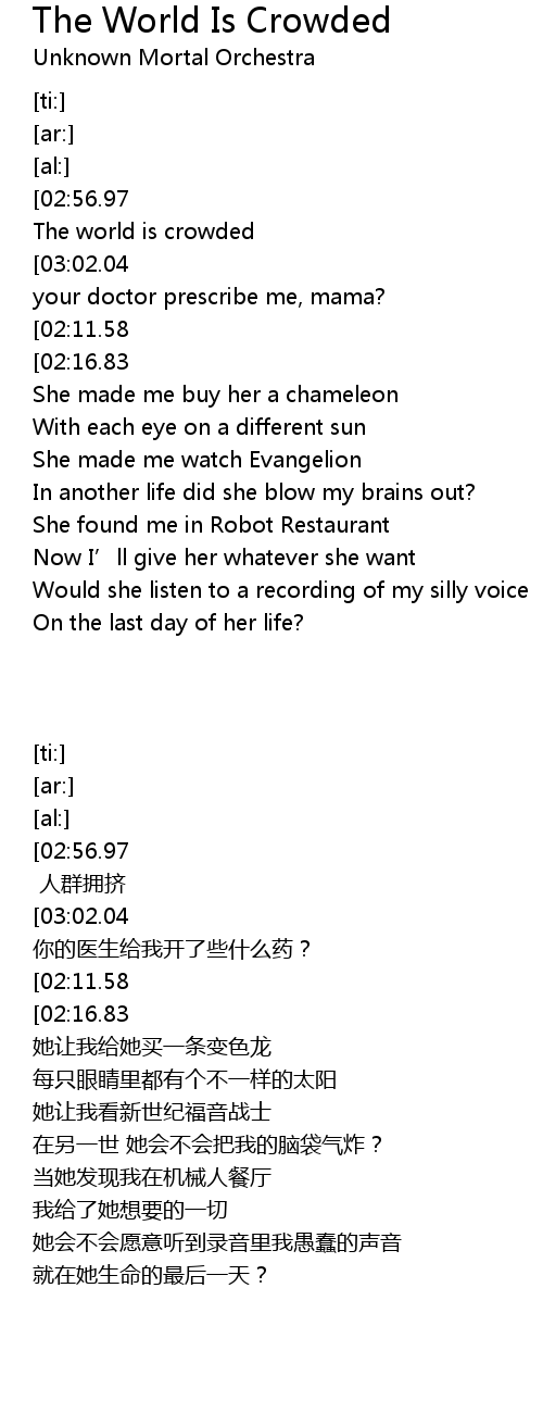 | [03:06.95][02:56.97][01:56.50][00:46.02][00:35.77][03:16.96][02:47.07][02:06.58][01:46.39][01:36.62][00:56.10][00:25.88] | (Woo) The world is crowded |
