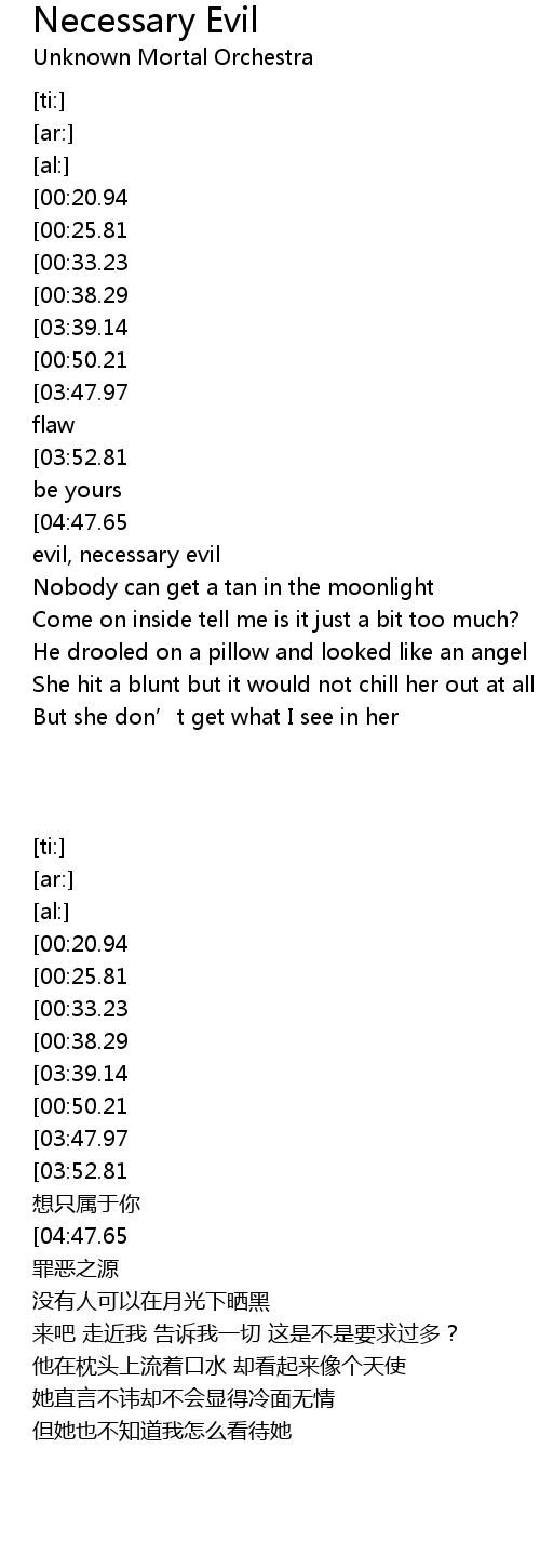 | [04:57.60][04:47.65][04:37.65][04:27.82][04:17.80][03:57.59][02:31.74][02:11.78][01:05.64] | Necessary evil, necessary evil |