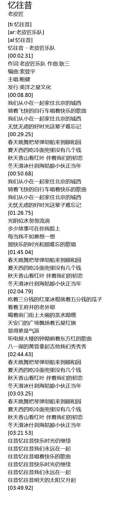 | [00:01.15] | 忆往昔 - 老皮匠乐队 |