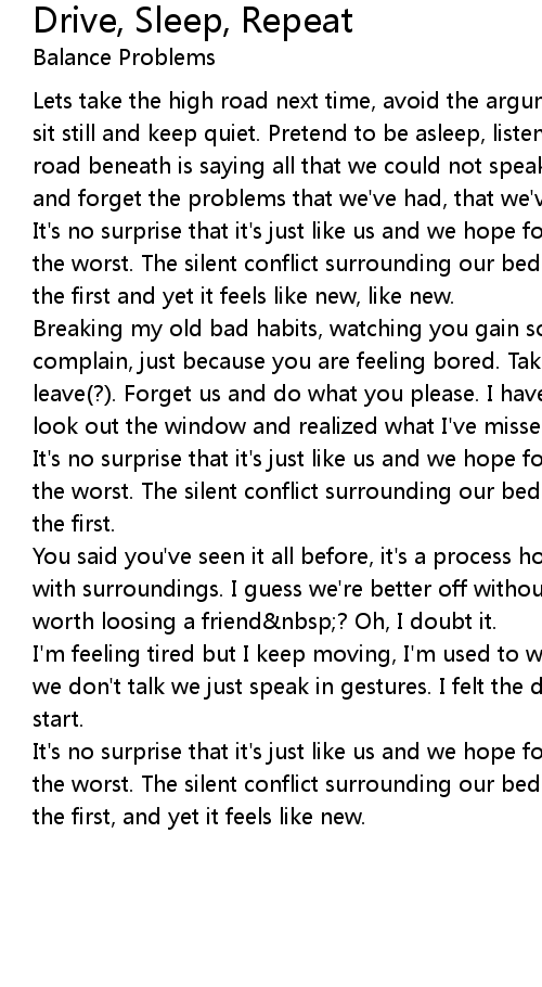 Lets take the high road next time, avoid the arguments. I felt discouraged as I sit still and keep quiet. Pretend to be asleep, listen to voices scream. The road beneath is saying all that we could not speak. And again we turn our backs and forget the problems that we've had, that we've had, that we've had. |