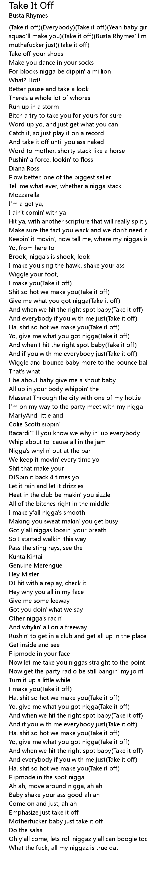 (Take it off)(Everybody)(Take it off)(Yeah baby girl)(Take it off)(Flipmode squad'll make you)(Take it off)(Busta Rhymes'll make you)(Take it off)(Hey muthafucker just)(Take it off) |