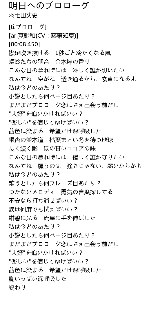 | [03:39.600] | まだまだプロローグ恋にさえ出会う前だし |