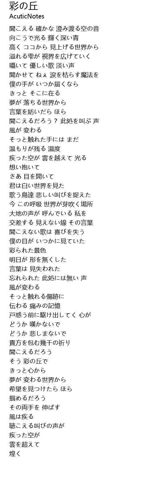 | [00:40.500] | 聞こえる 確かな 澄み渡る空の音 |