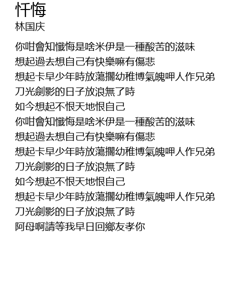 | [00:26.442] | 你咁會知懺悔是啥米伊是一種酸苦的滋味 |
