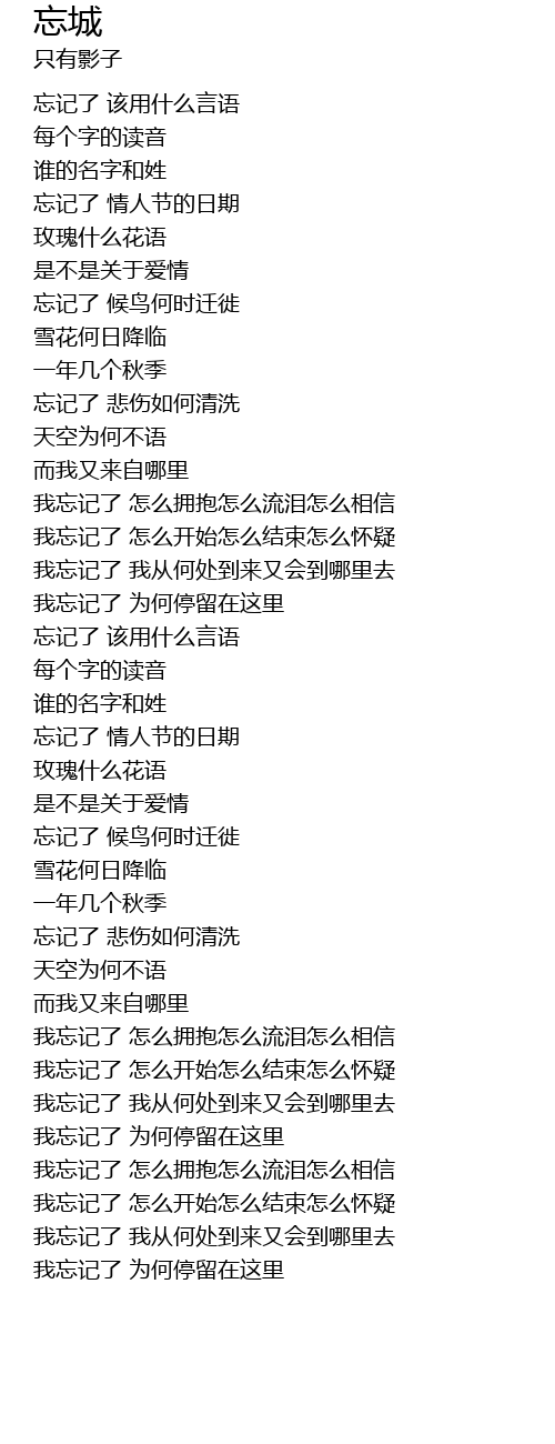 | [02:30.788] | 我忘记了 怎么开始怎么结束怎么怀疑 |