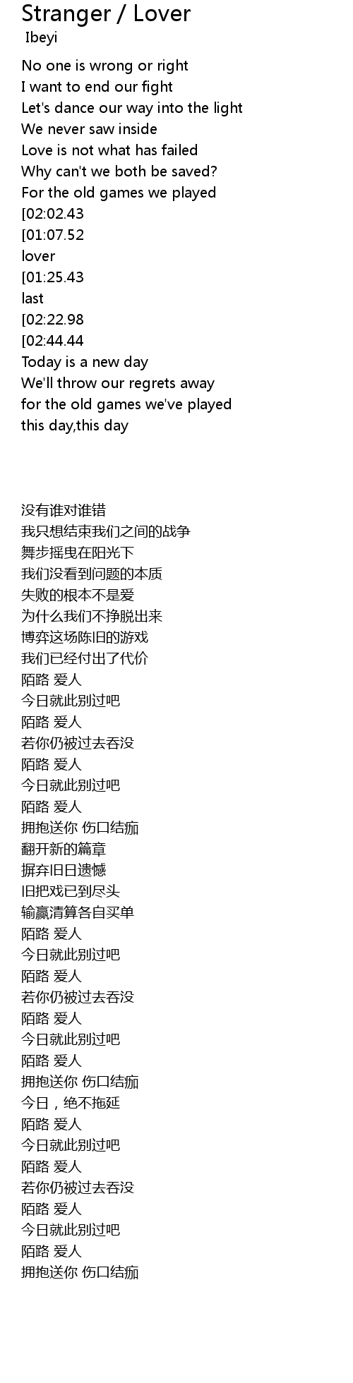 | [00:56.58][01:07.52][01:17.89][01:29.09][02:05.91][02:16.48][02:27.12][02:37.92][03:12.56][03:23.12][03:33.80][03:44.60] | Stranger lover |