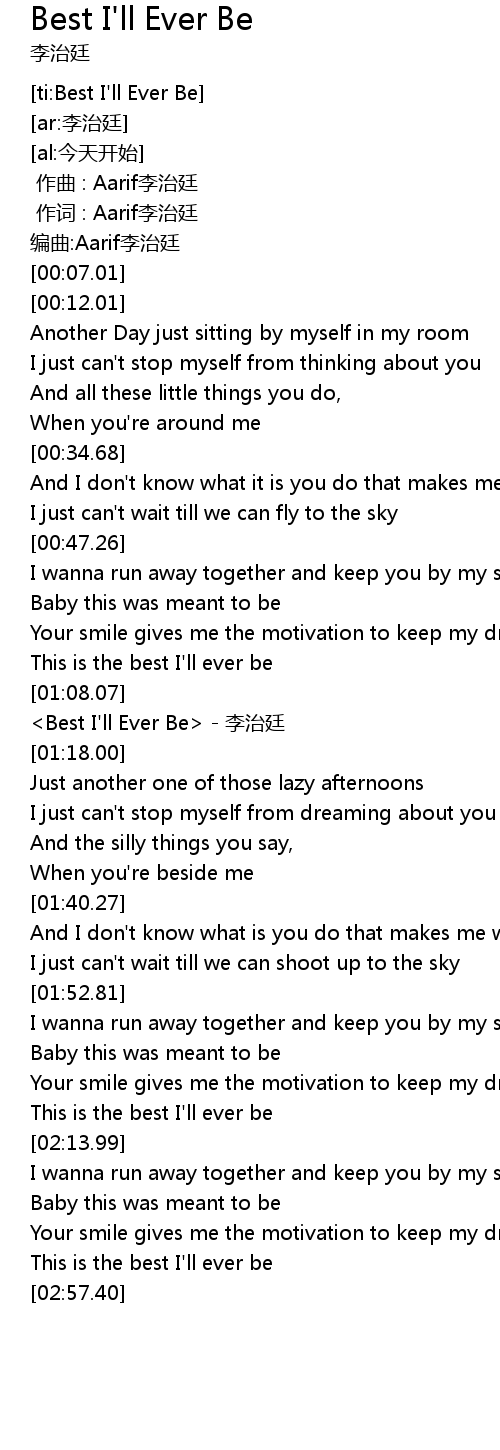 | [01:09.50] | <Best I'll Ever Be> - 李治廷 |