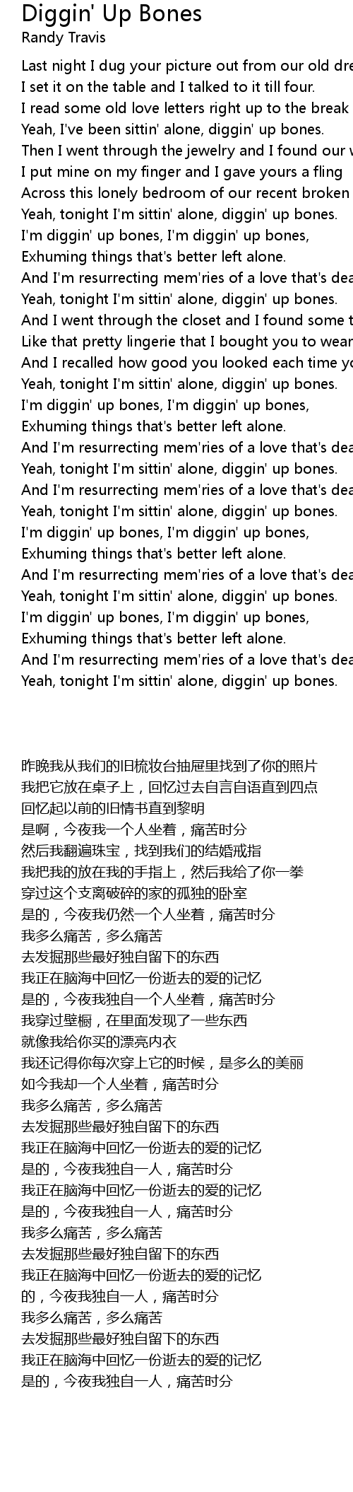 Yeah, tonight I'm sittin' alone, diggin' up bones. |