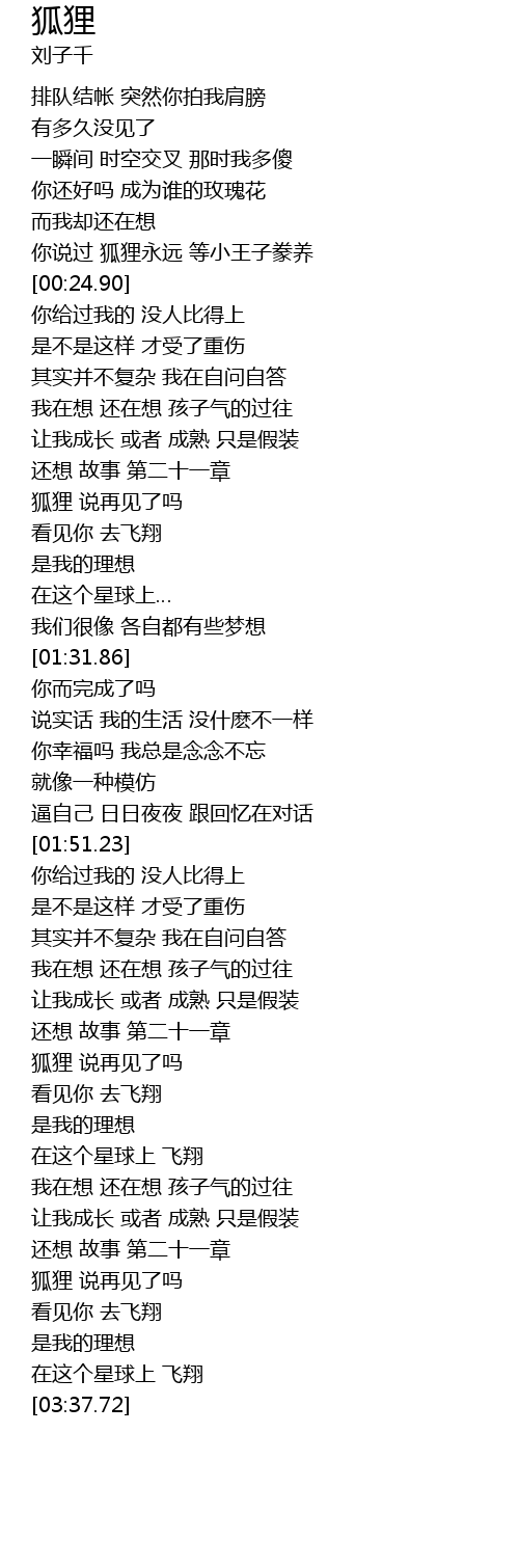 | [00:21.03] | 你说过 狐狸永远 等小王子豢养 |