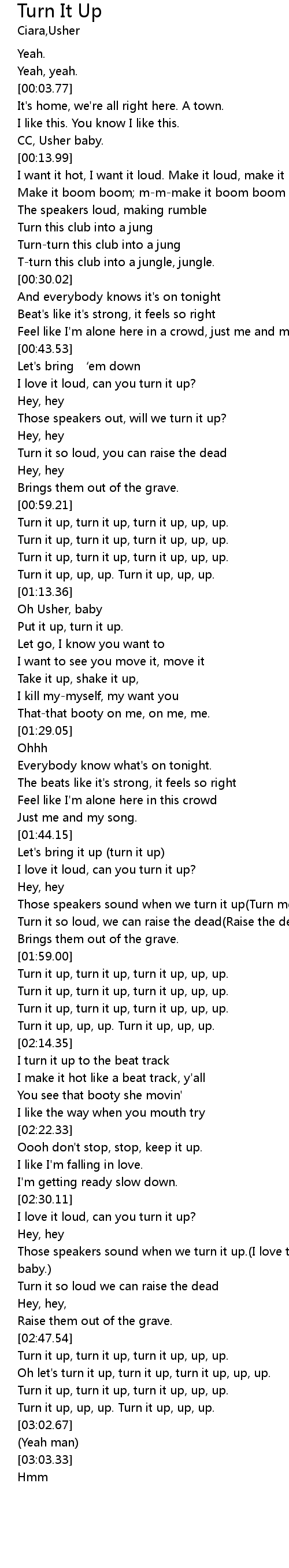 | [02:03.24] | Turn it up, turn it up, turn it up, up, up. |