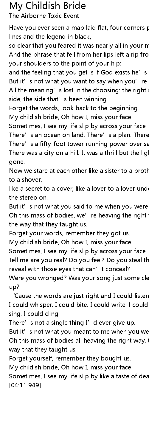 | [01:02.149] | My childish bride, Oh how I, miss your face |