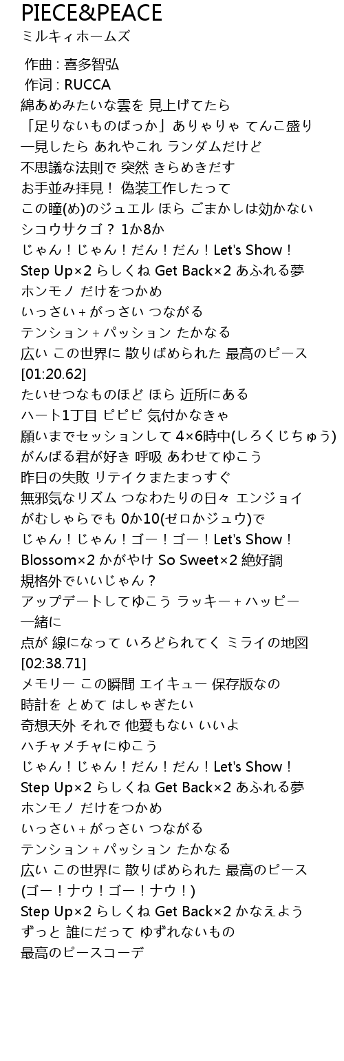 | [03:51.42] | ずっと 誰にだって ゆずれないもの 最高のピースコーデ |
