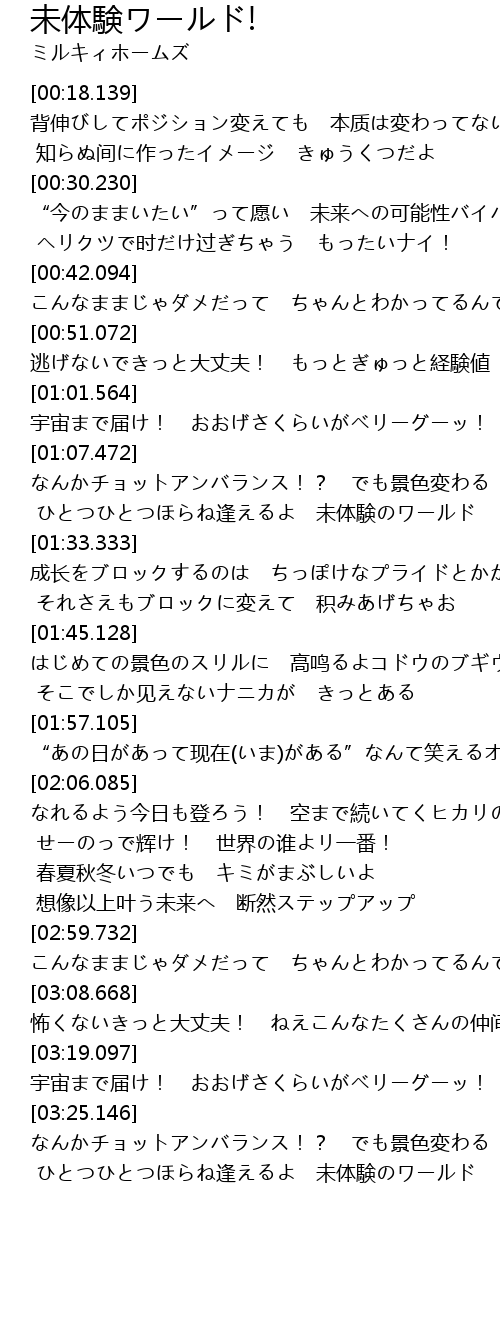 | [01:13.512] | ひとつひとつほらね逢えるよ 未体験のワールド |