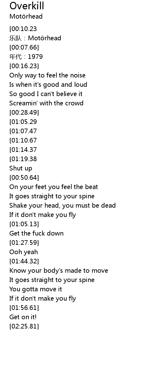 | [02:11.89][01:19.38][00:44.00] | Overkill |