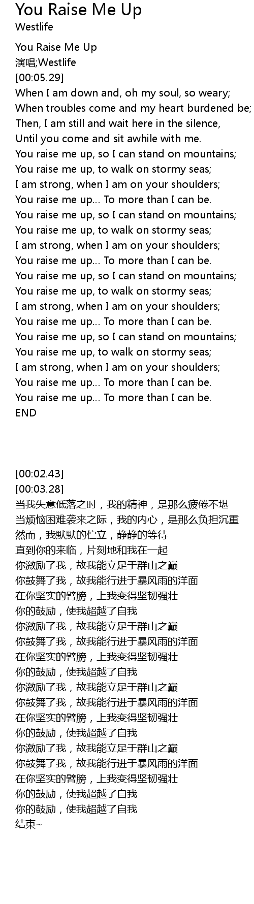 | [02:50.94] | You raise me up To more than I can be. |