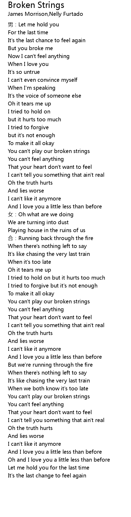 | [00:56.288] | You can' t play our broken strings |