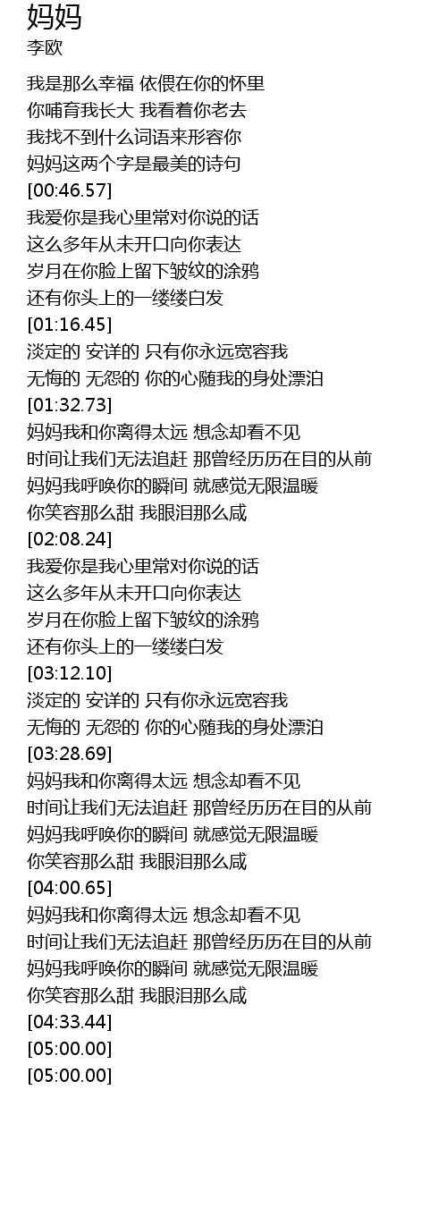 | [04:16.97] | mā mā wǒ hū huàn nǐ de shùn jiān jiù gǎn jué wú xiàn wēn nuǎn |
