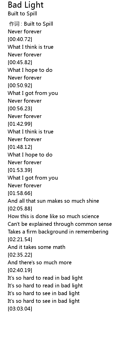 | [02:58.41] | It' s so hard to see in bad light |
