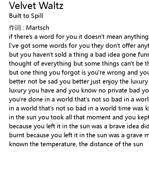 | I' ve got some words for you they don' t offer anything you cold called everybody but you haven' t sold a thing a bad idea gone funny a pinch felt in a dream you thought of everything but some things can' t be thought you thought of everything but one thing you forgot is you' re wrong and you better not be angry and you better not be sad you better just enjoy the luxury of sympathy if that' s a luxury you have and you know no private bad you know that that' s the meaning of you' re done in a world that' s not so bad in a world time was killing in the sun in a world that' s not so bad in a world time was killing in the sun in the sun in the sun you took all that moment and you kept it in the sun now it' s gone because you left it in the sun was a brave idea didn' t mean no harm now it' s burnt because you left it in the sun was a grave mistake but how could you have known the temperature, the distance of the sun |