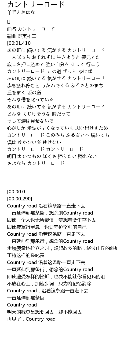 | [02:00.130][00:01.410] | カントリーロード この道 ずっと ゆけば |