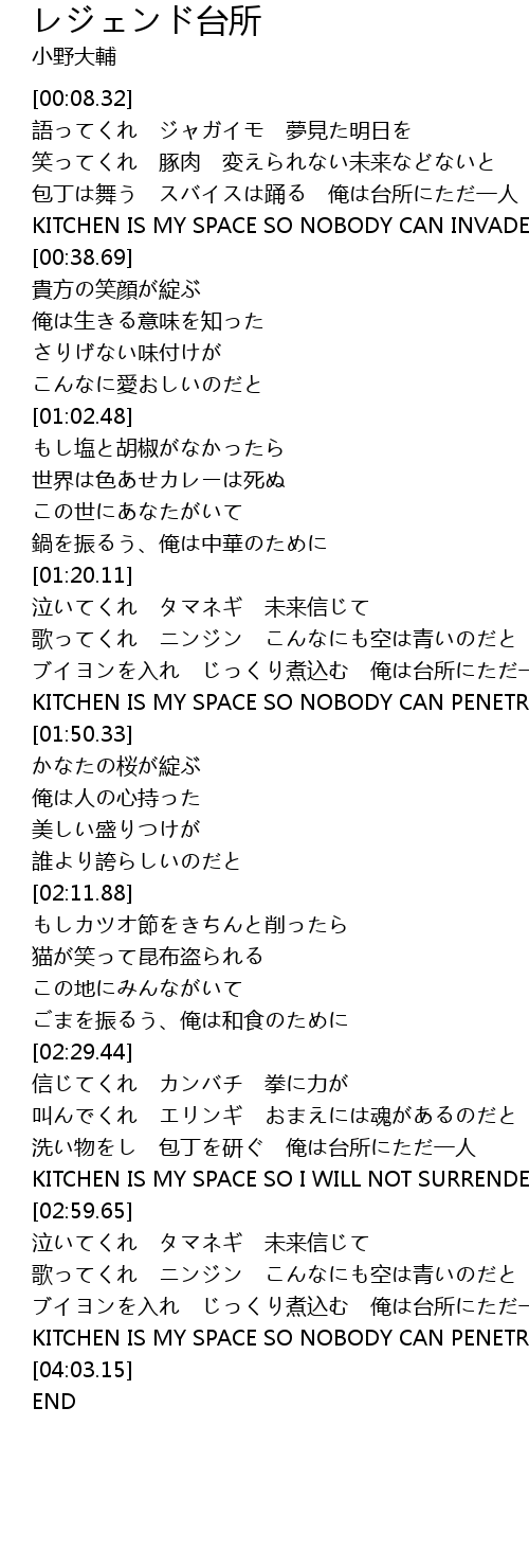 | [02:54.70] | KITCHEN IS MY SPACE SO I WILL NOT SURRENDER |