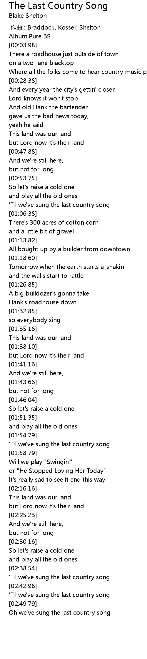 | [02:45.91] | 'Til we've sung the last country song |