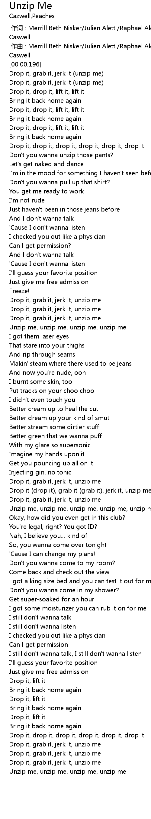 | [03:25.049] | Unzip me, unzip me, unzip me, unzip me |