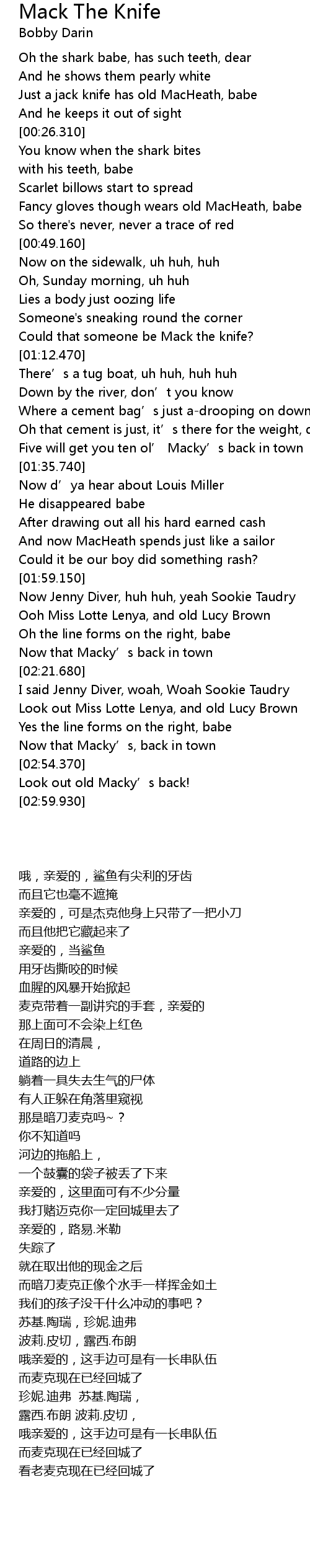 | [00:15.430] | Just a jack knife has old MacHeath, babe |