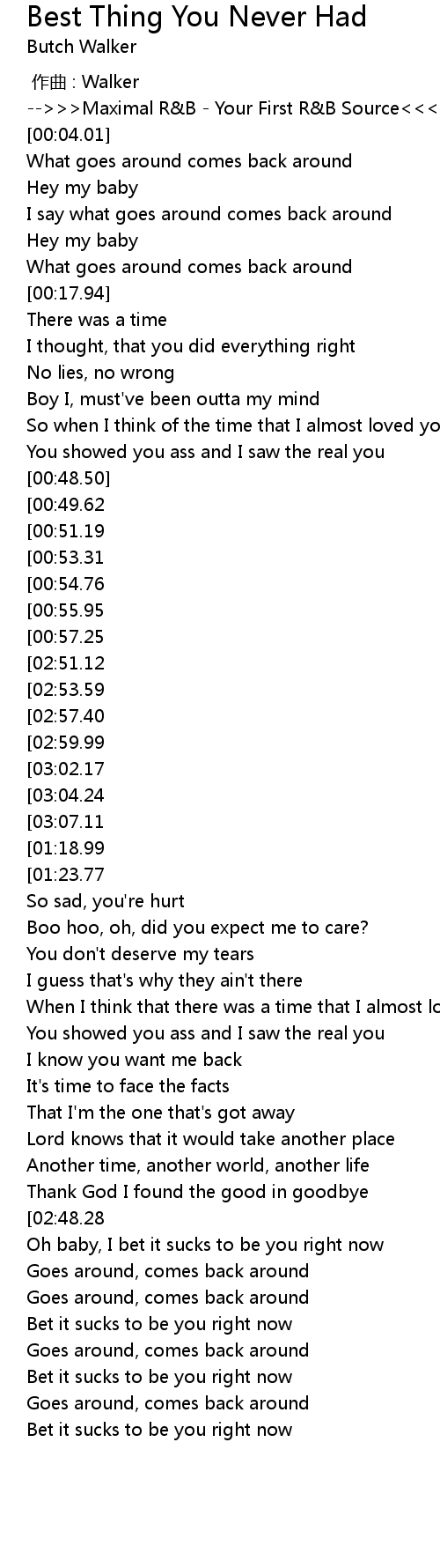 | [03:09.39][03:07.11][02:21.08][01:15.68] | Best thing you never had |