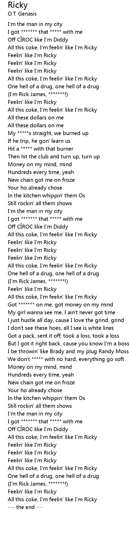 | [00:45.93] | All this coke, I'm feelin' like I'm Ricky |