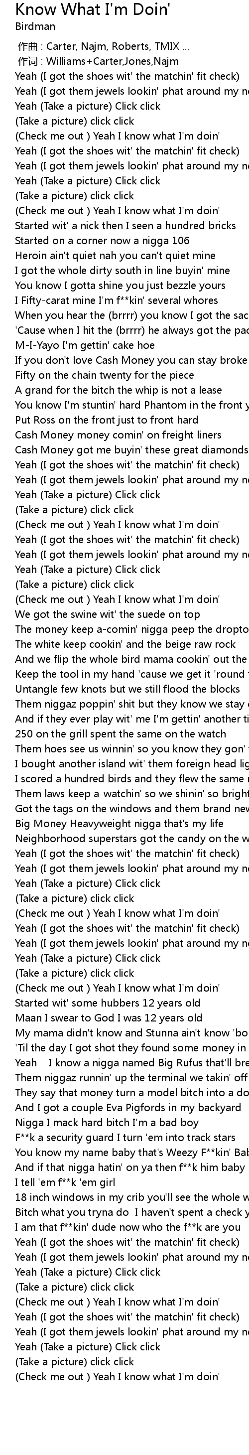 | [00:33.83] | (Check me out ) Yeah I know what I'm doin' |