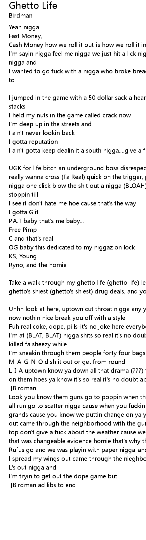 Take a walk through my ghetto life (ghetto life) let me show you that my ghetto's shiest (ghetto's shiest) drug deals, and young niggaz gettin'killed |