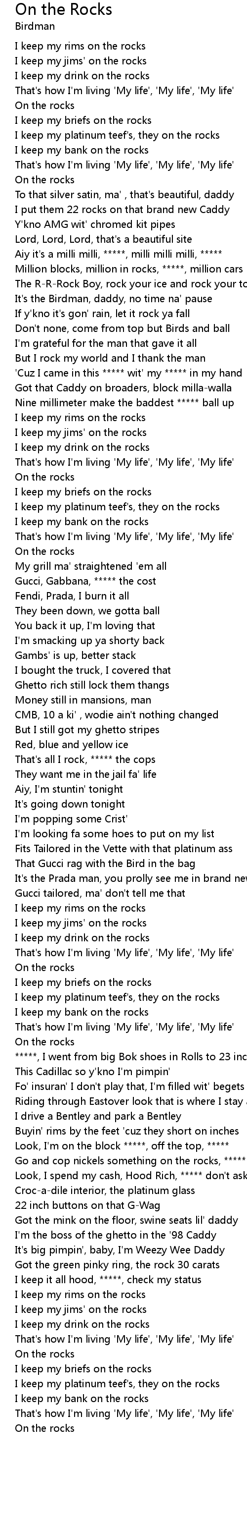 Million blocks, million in rocks, *****, million cars |