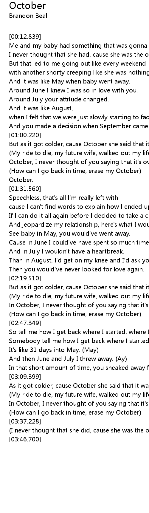 | [01:14.400] | October, I never thought of you saying that it' s over. |