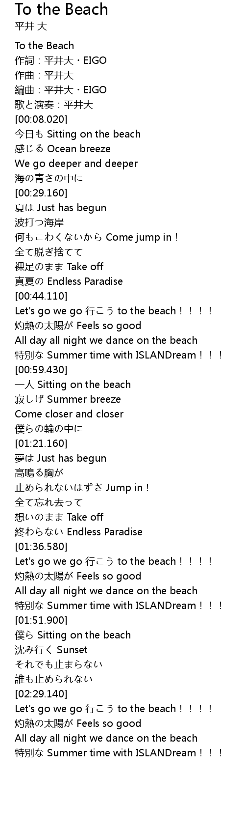 | [02:30.140] | Let's go we go 行こう to the beach!!!! |