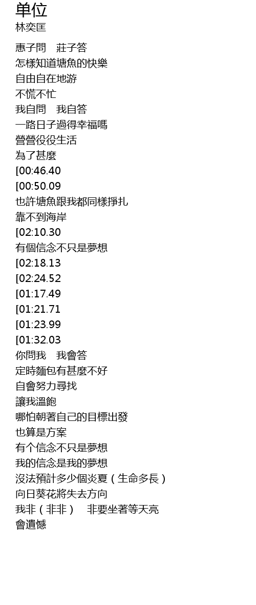 | [00:21.38] | 怎樣知道塘魚的快樂 |