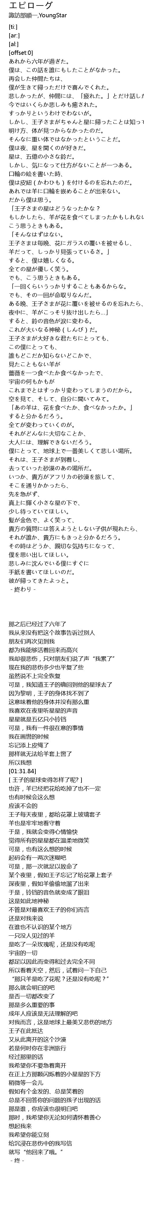 | [00:35.20] | しかし、王子さまがちゃんと星に帰ったことは知っている。 |