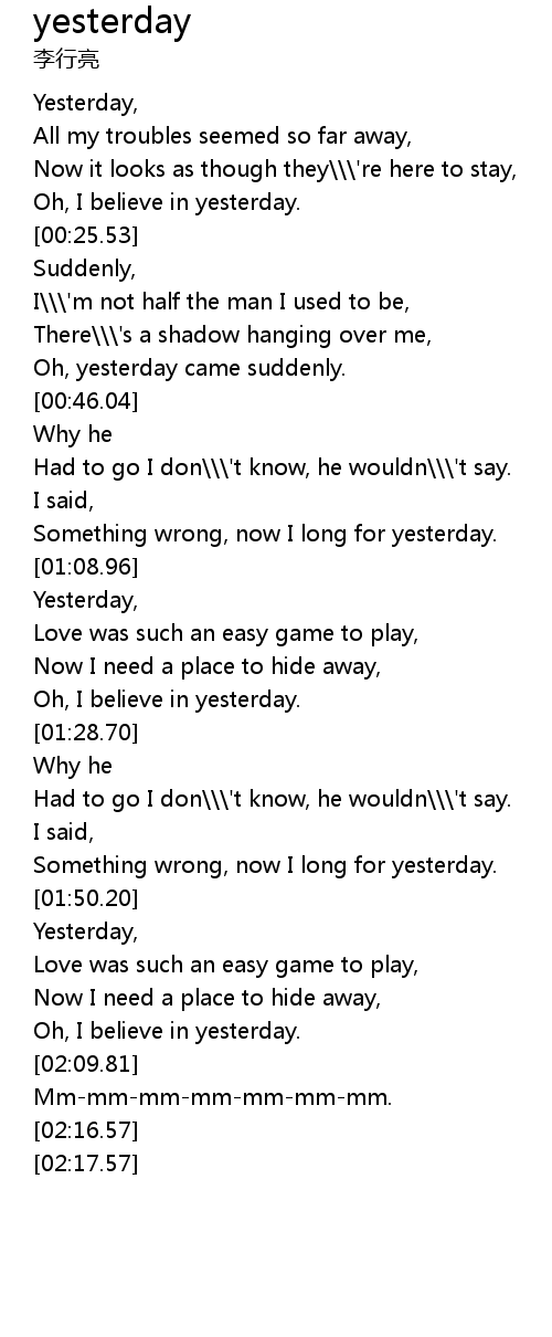 | [00:40.16] | Oh, yesterday came suddenly. |