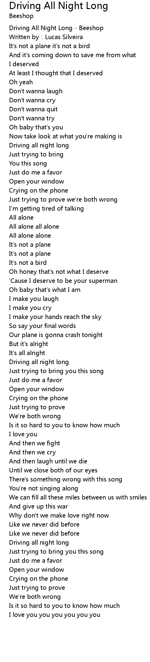 | [00:00.100] | Driving All Night Long Beeshop |