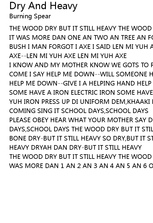 PLEASE OBEY HEAR WHAT YOUR MOTHER SAY DIS IS -DIS IS- DIS IS- DIS IS SCHOOL DAYS,SCHOOL DAYS THE WOOD DRY BUT IT STILL HEAVY THE WOOD DRY BUT IT STILL HEAVY BONE DRY-BUT IT STILL HEAVY SO DRY,BUT IT STILL HEAVY WELL DRY-BUT IT STILL HEAVY DRYAH DAN DRY-BUT IT STILL HEAVY |
