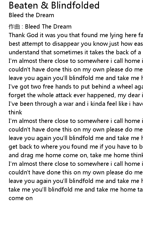 | I'm almost there close to somewhere i call home it feels much brighter here i couldn't have done this on my own please do me just one favor under oath if i leave you again you'll blindfold me and take me home you'll blindfold me and take me you'll blindfold me and take me home take me home come on, take me home come on |