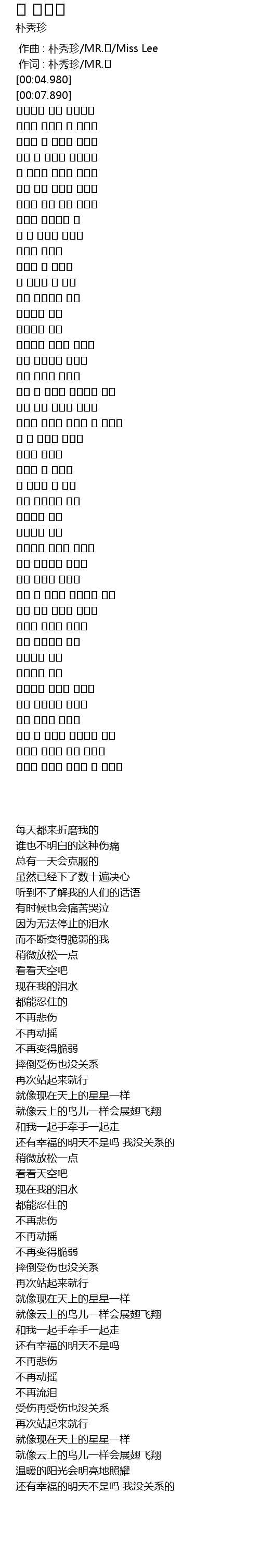 | [00:01.00] | 作词 : 朴秀珍/MR.강 |