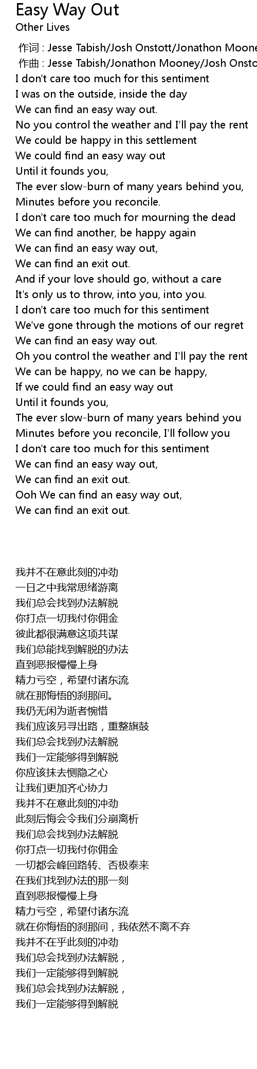 | [00:01.000] | zuo qu : Jesse Tabish Jonathon Mooney Josh Onstott |