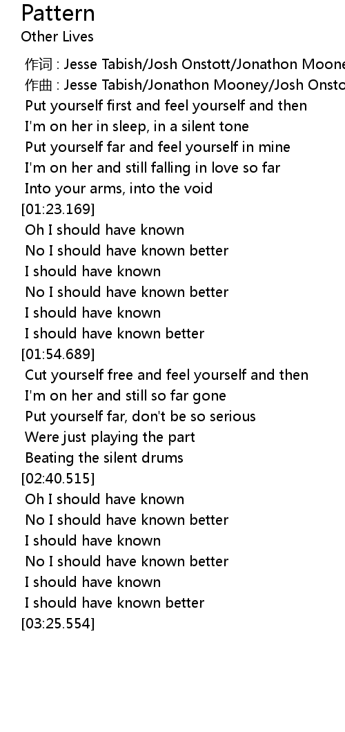 | [00:01.000] | 作曲 : Jesse Tabish/Jonathon Mooney/Josh Onstott |