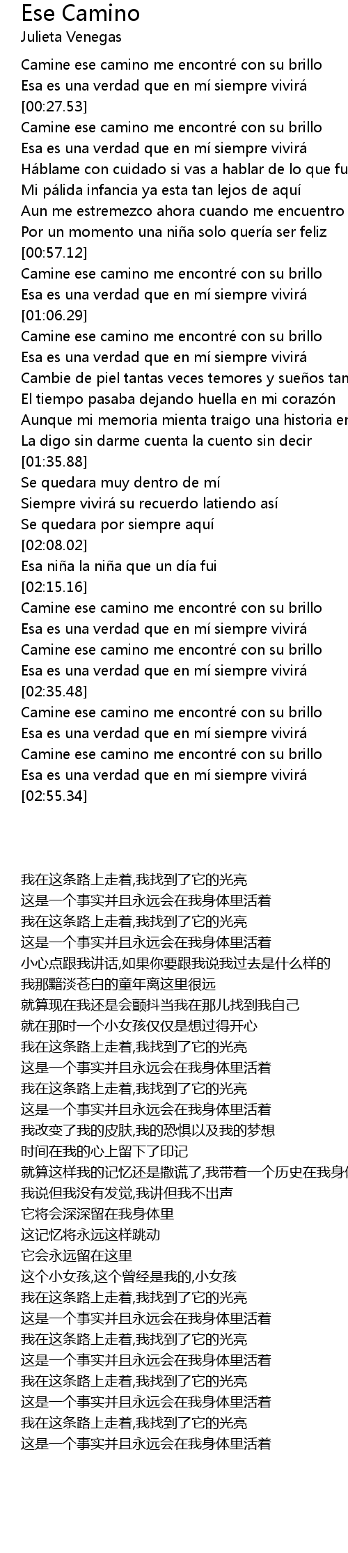 | [00:18.87] | Camine ese camino me encontre con su brillo |