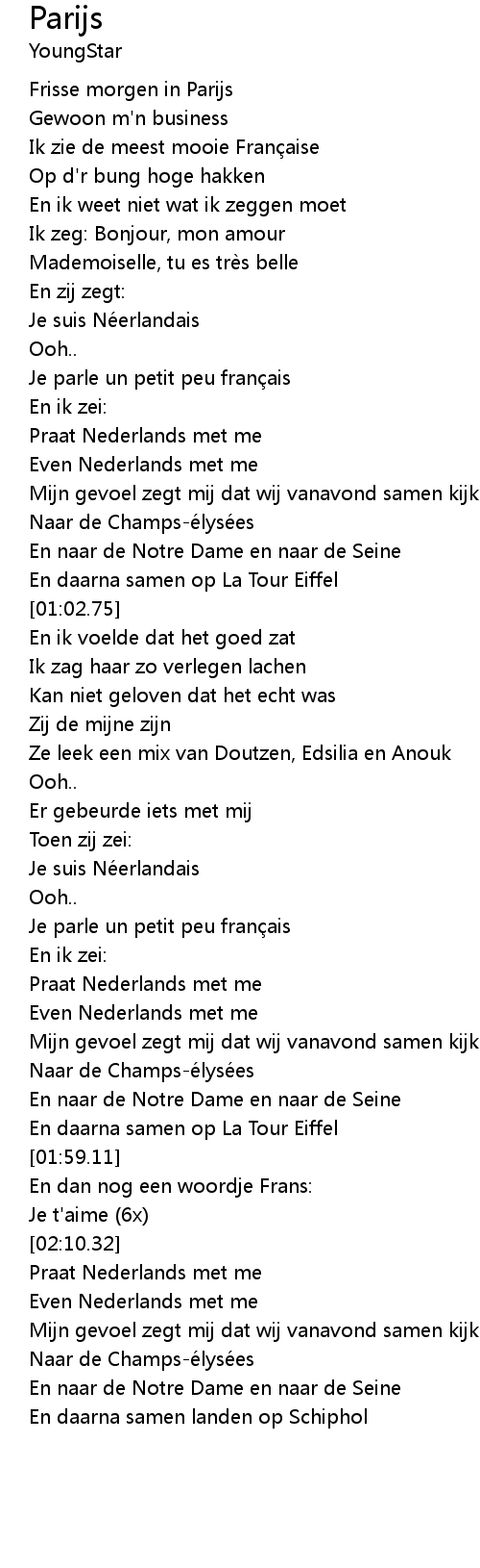 | [00:57.50] | En daarna samen op La Tour Eiffel |
